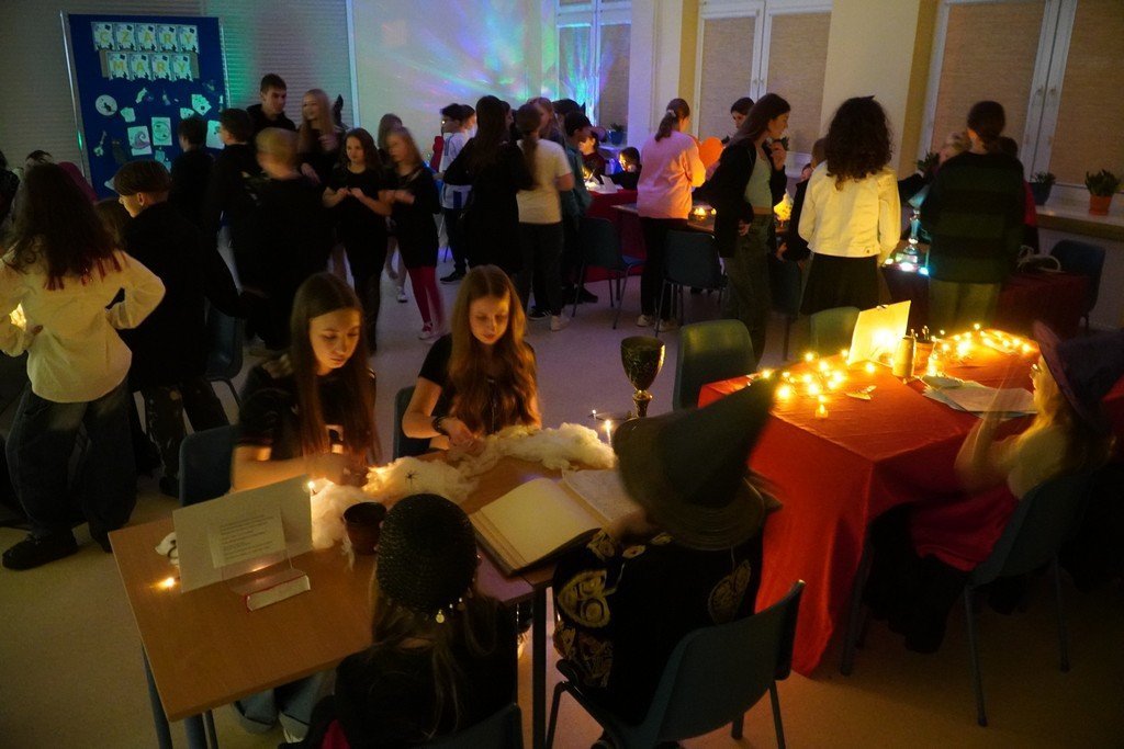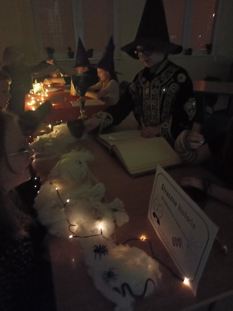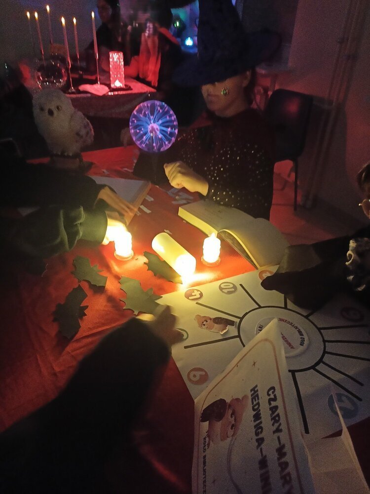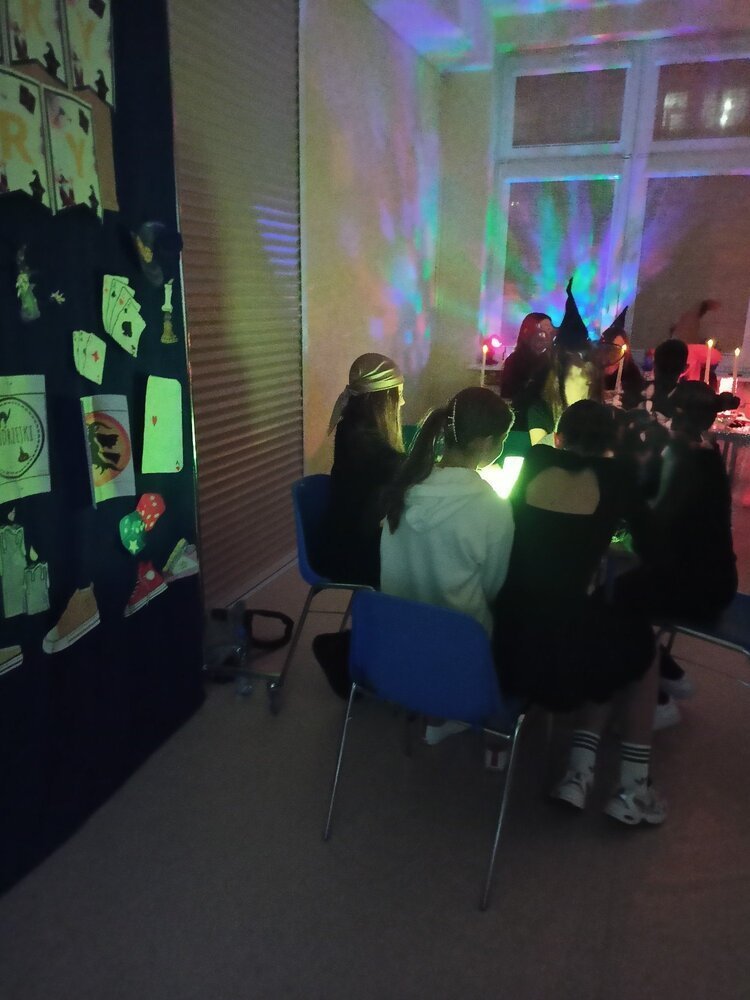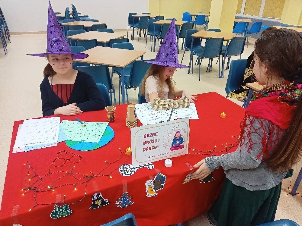 Jedną z największych atrakcji była sala wróżb – niezwykle barwna, tajemnicza i prawdziwie magiczna! Wróżki i wróżbici – członkowie Koła Bibliotecznego oraz Koła Samorządu Uczniowskiego– pod czujnym okiem p. Renaty Piliczewskiej, przygotowali tematyczne stanowiska pełne kolorowych dekoracji, rekwizytów i atrybutów związanych ze sztuką przepowiadania przyszłości. Ich przebrania budziły zachwyt i świetnie wprowadzały uczestników w andrzejkowy klimat.